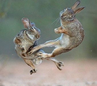 Rabbits may give you an innocent nip to get your attention but they can also bite to show dominance, out of fear, or to say they don't like something/someone.5 Rabbits may bite each other if they are fighting or if an established rabbit doesn't like a new rabbit, out of sexual frustration or to establish a hierarchy with the other rabbits they live with, or simply because they don't want to do something if you are trying to pick them up or put them in a cage. Rabbits aren't usually aggressive and neutering or spaying can help resolve any aggressive tendencies.